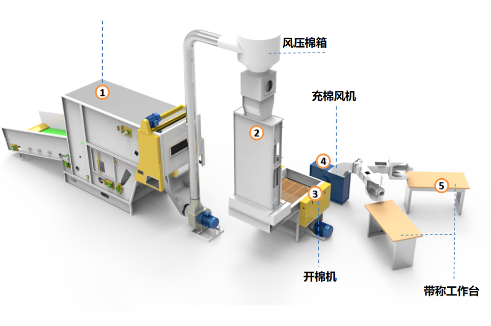 ①該生產線主要用于將滌綸短纖維原料開松并定量填充到枕頭、抱枕、沙發坐墊中。