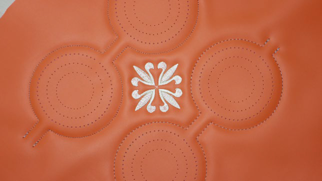1、實現(xiàn)繡花、縫紉、沖孔于一體,花型任意設計,輕松實現(xiàn)沖、繡、縫任意搭配的復雜工藝。