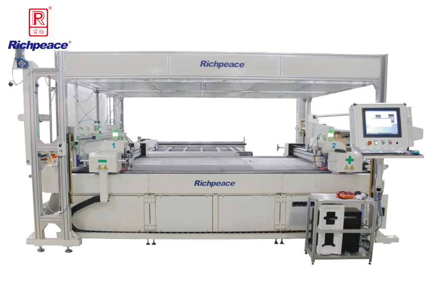 適用于汽車座椅、方向盤加熱部件的全自動切割。集智能視覺、自動送料、自動覆膜、自動收料、文字標注、電熱絲切割、面料切割于一體,通過高頻振動刀和圓刀切割,切割材料邊緣平整光滑。