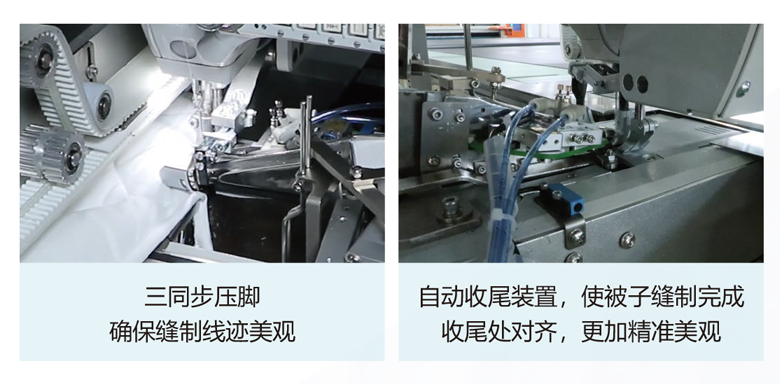 5、自動(dòng)收尾裝置,使被子縫制完成收尾處對(duì)齊,更加精準(zhǔn)美觀。