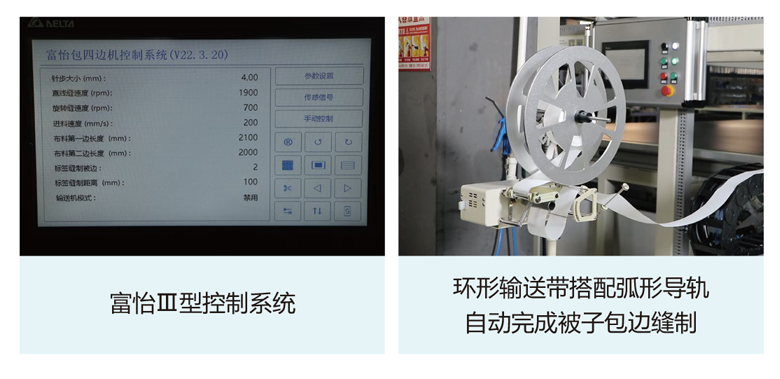 2、環(huán)形輸送帶搭配弧形導(dǎo)軌,自動(dòng)完成被子包邊縫制。
