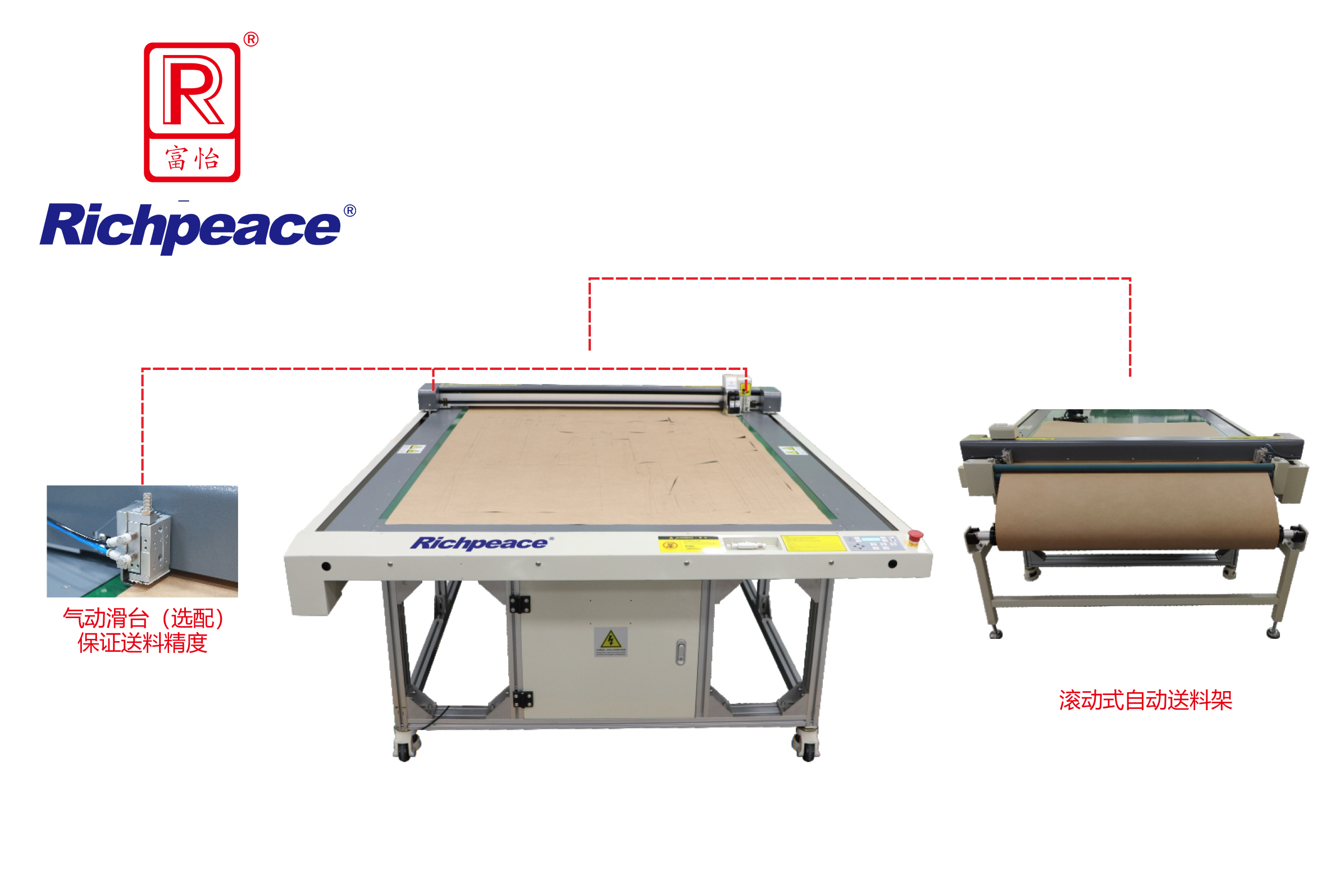 9、采用氣動滑臺夾取材料,保證送料精準(zhǔn)度,實現(xiàn)超長圖形的 打印和切割(選配)。